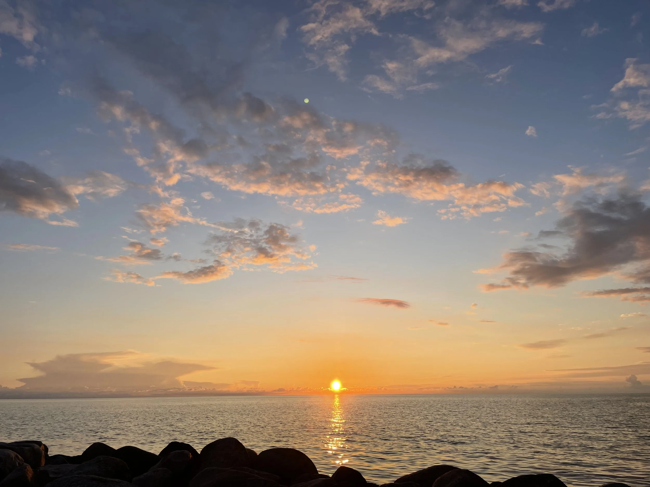 Sunset over the ocean with a rocky shoreline in the foreground, scattered clouds in the sky, and the moon visible above.